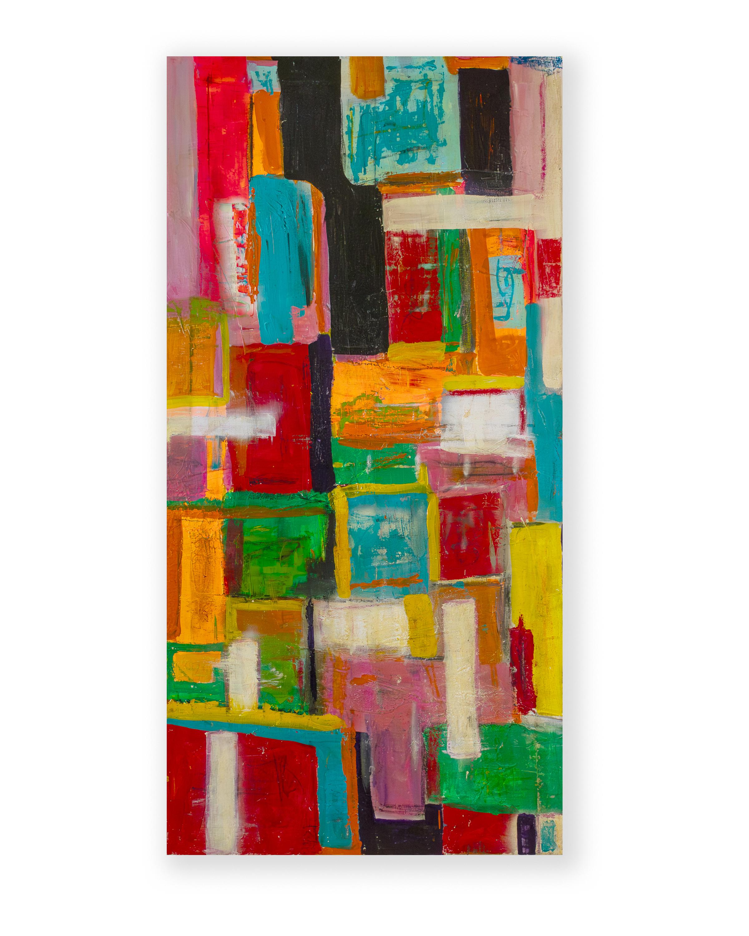 Die Komposition ist als ein spannungsvolles Gefüge aus geschichteten Farbmodulen aufgebaut. Während explosives Rot, leuchtendes Gelb und tiefes Türkis eine hochenergetische, fast kinetische Präsenz entfalten, setzen schwarze Flächen und vertikale weiße Akzente architektonische Ankerpunkte. Diese Struktur verleiht dem Werk eine intellektuelle Strenge inmitten der expressiven Farbgewalt.