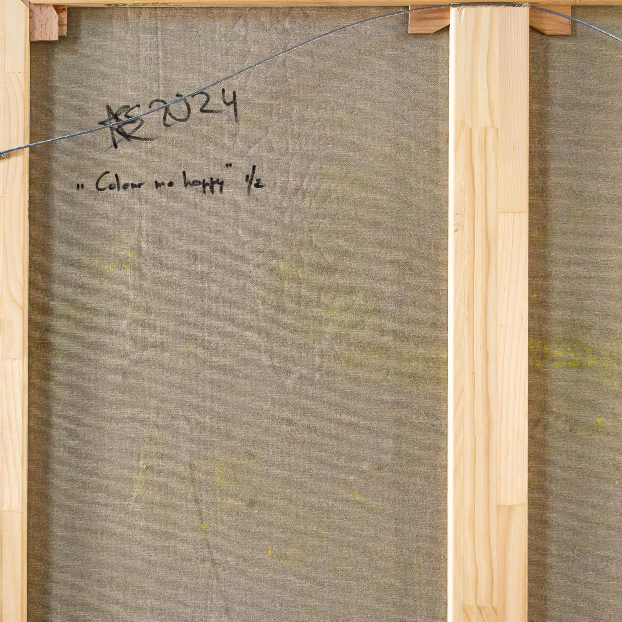 Der Farbauftrag ist haptisch und betont physisch, was den Charakter des „Action Painting“ unterstreicht. Ein für Snijders Arbeiten typischer Firnis verleiht dem Werk einen besonderen Glanz, der die chromatische Intensität verstärkt und den Anschein erweckt, als wären die Farben noch immer frisch aufgetragen. Der Titel Colour me happy fungiert hierbei nicht als bloße Beschreibung, sondern als emotionaler Imperativ. Snijder nutzt die rein abstrakte Form, um Optimismus und Lebensfreude als unmittelbare energetische Entladung auf den Betrachter zu übertragen. In der Gegenüberstellung der beiden Teile des Diptychons entsteht ein kraftvoller Dialog zwischen Form und Energie, der den Raum mit einer physisch greifbaren Vitalität auflädt. Das Ergebnis ist eine Kunst, die keine erzählerischen Umwege benötigt, sondern durch ihre strukturelle Kraft im Hier und Jetzt wirkt.