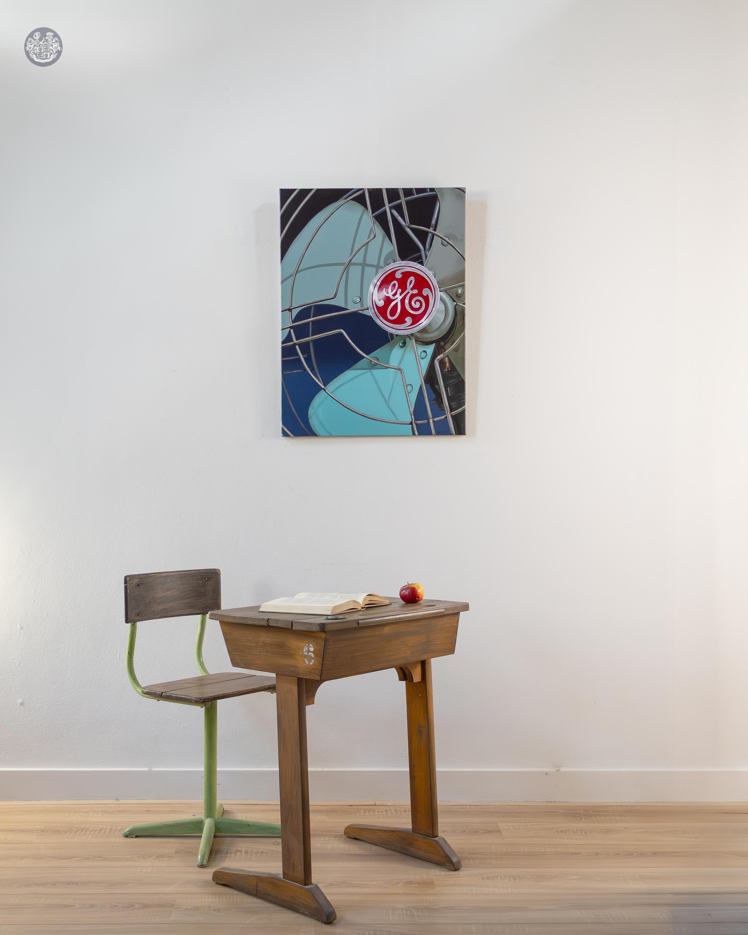 Inhaltlich erhebt der Titel GE fan den simplen Gebrauchsgegenstand zum musealen Objekt, indem er ihn aus seinem funktionalen Kontext reißt. Das Werk zelebriert ein zeitloses Industriedesign und fungiert innerhalb der Serie Vintage stuff als ein kraftvoller Ankerpunkt für kollektive Erinnerungen. Die detaillierte Darstellung der Alterungsspuren und die geometrische Strenge des Schutzgitters erzeugen eine Spannung zwischen Haltbarkeit und Vergänglichkeit. Die Interpretation schwankt zwischen der Feier technologischer Meilensteine und einer subtilen Reflexion über die Allgegenwärtigkeit globaler Marken, die sich tief in unser visuelles Gedächtnis eingeschrieben hat und eine gewisse Nostalgie hervorruft.
