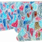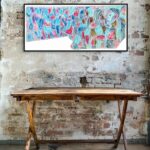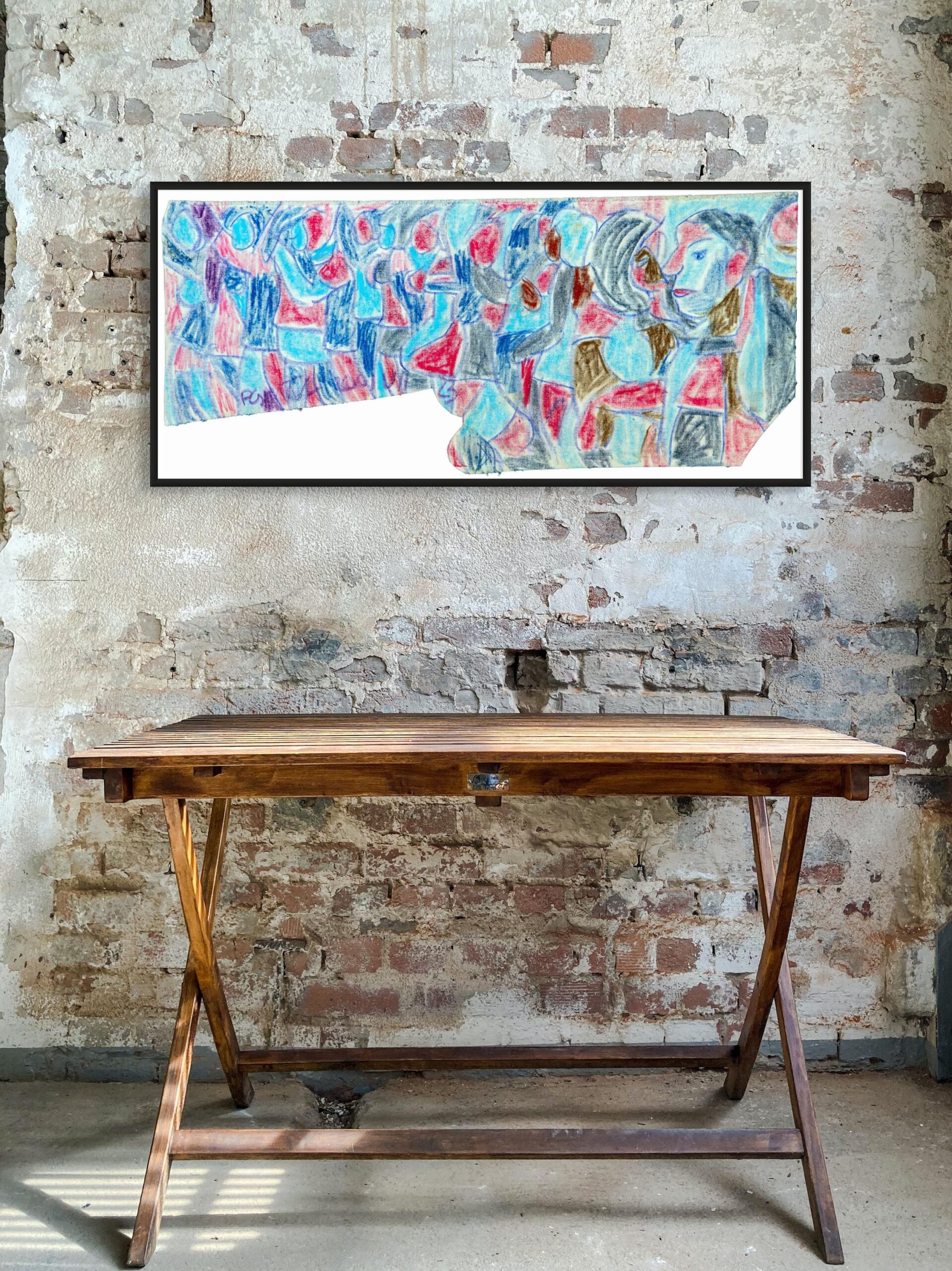 Dancing Group (2001) by Miklos Nemeth is a vibrant oil on fabric piece measuring 36 x 82 cm. The artwork features a dynamic assembly of figures rendered in a style reminiscent of abstract expressionism with elements of primitivism. The figures are characterized by bold outlines and simplified forms, evoking a sense of movement and rhythm. Dominated by a palette of vivid blues, reds, and earthy tones, the composition captures the energy of a dancing crowd, blending expressive brushwork and symbolic abstraction to convey a communal celebration. Nemeth’s style in this piece highlights his unique approach to capturing human motion and social interaction.
