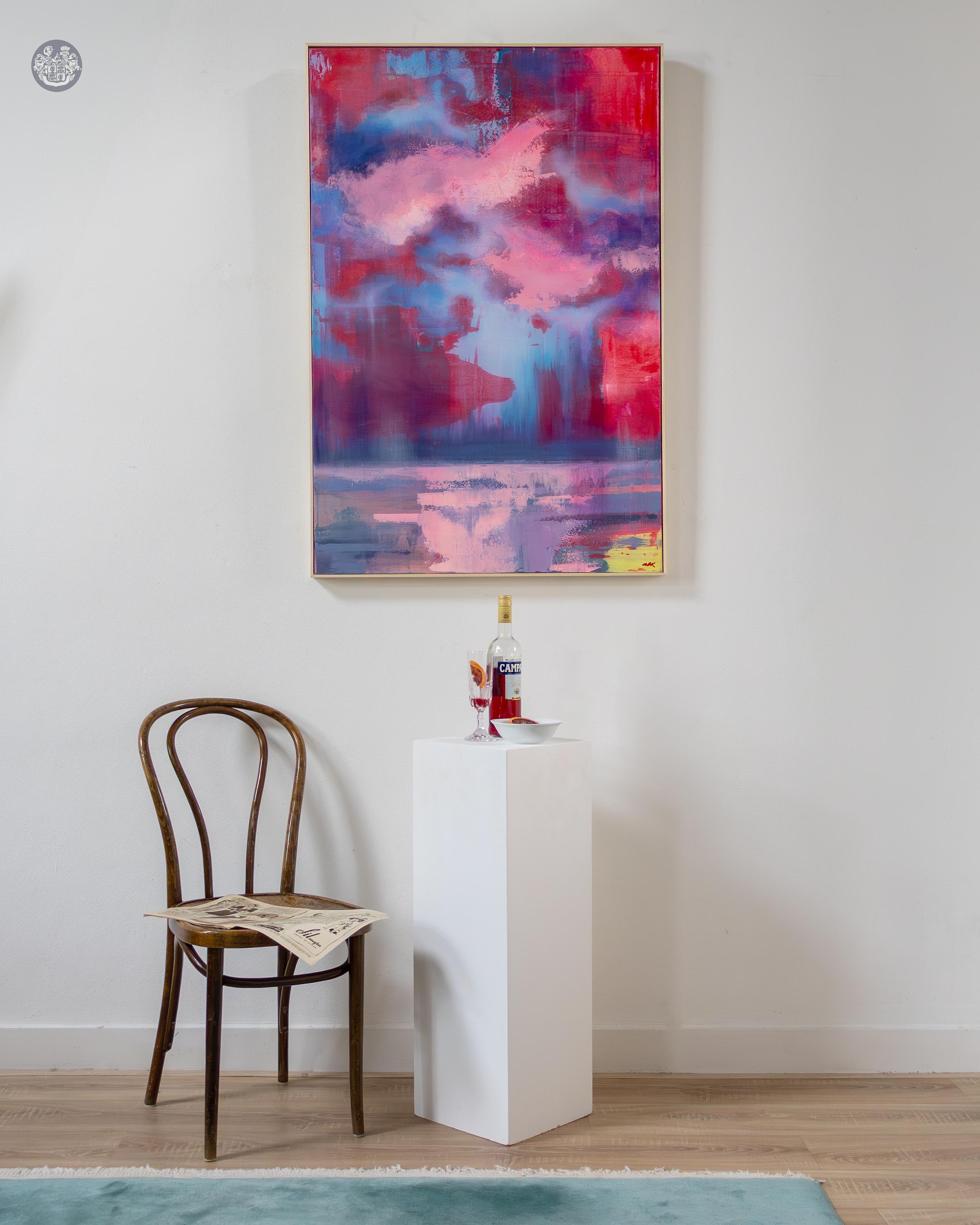 Dans Hypnotic Clouds, Ana Barbić Katičić capture la magie d’une soirée pittoresque où la lumière se fragmente en tons dramatiques de violet et de rose. L’œuvre est dominée par une intensité chromatique presque hypnotique qui transporte immédiatement le spectateur dans l’atmosphère d’une soirée d’été au bord de la mer. Tandis que la moitié supérieure du tableau est définie par de lourdes formations nuageuses riches en couleurs, la lumière résiduelle du jour se reflète en tons pastels sur la surface de l’eau. C’est ce moment particulier du crépuscule où l’air est encore chaud et où le ciel déploie ses couleurs les plus spectaculaires.