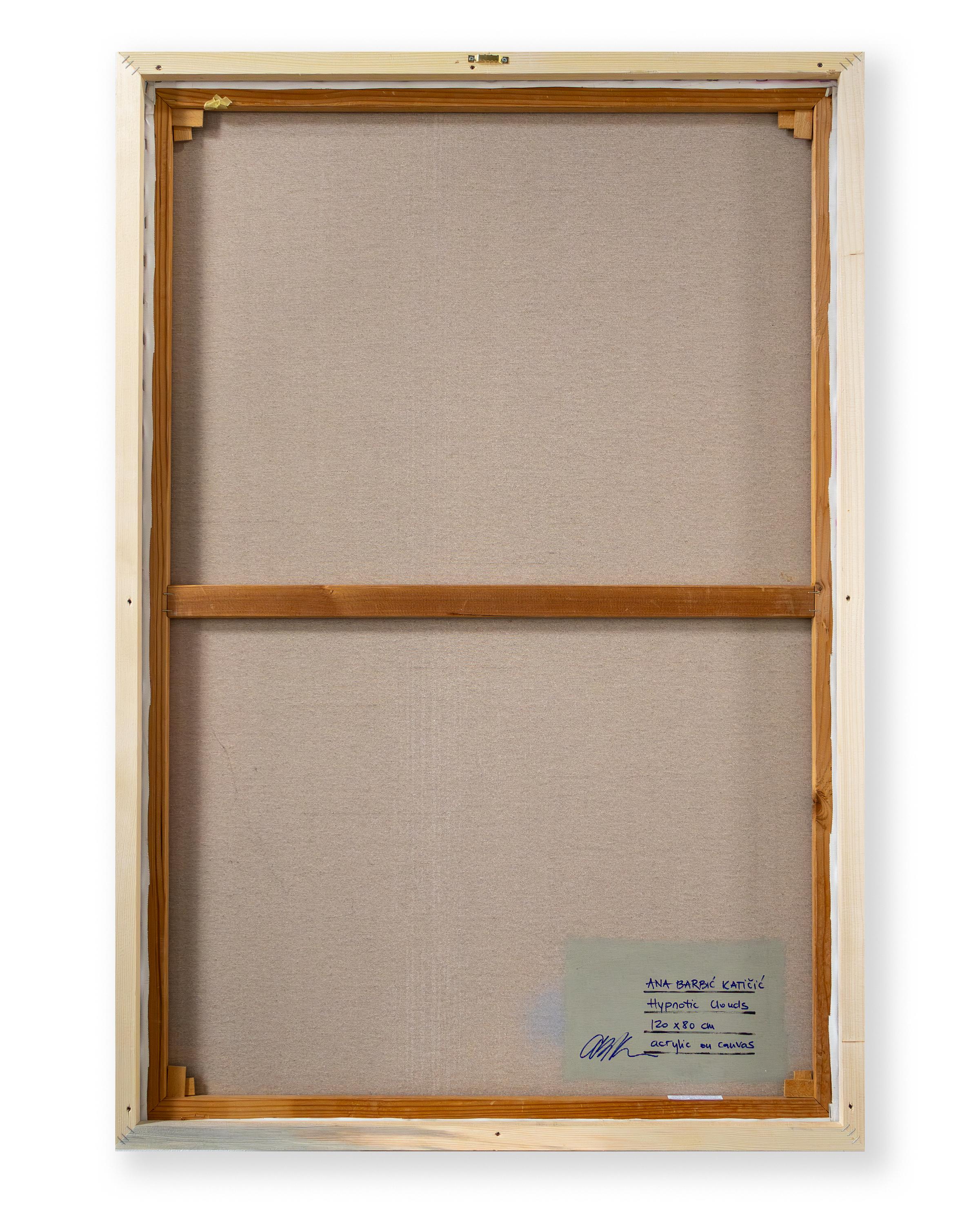 Techniquement magistrale, l’artiste combine dans cette œuvre des lasures fines avec la technique distinctive du racle. Alors que le ciel acquiert une luminosité éclatante grâce à la superposition de fines couches de peinture, la surface de la mer et la ligne d’horizon ont été façonnées par l’étirement vigoureux de la matière au racle ou à la spatule. Cette superposition crée une texture haptique qui contraste parfaitement le scintillement de l’eau avec les structures brutes de la côte. Hypnotic Clouds saisit cet instant que l’on connaît en vacances, quand on ne peut détourner le regard de l’horizon – une œuvre qui éveille instantanément le désir d’une prochaine soirée au bord de la mer.