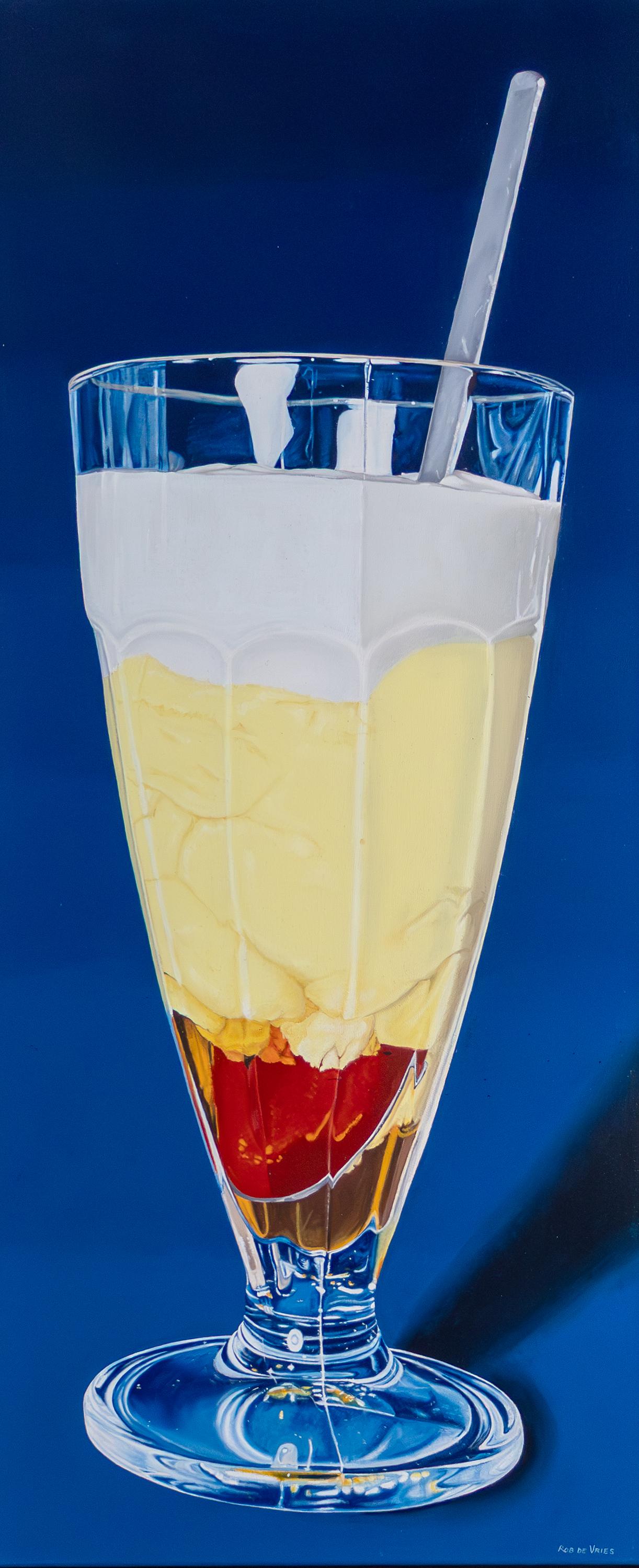 … or do you prefer a Vanilla Vlaflip? est une œuvre qui captive par sa précision photoréaliste infaillible. Rob de Vries utilise une lumière cliniquement pure pour analyser la nature physique du verre et de son contenu dans les moindres détails. La virtuosité technique, qui rappelle l’esthétique froide de Ralph Goings, donne à l’objet une présence physique qui dépasse de loin la simple représentation. Le banal est ainsi isolé et élevé au rang d’objet d’art monumental, presque intemporel.