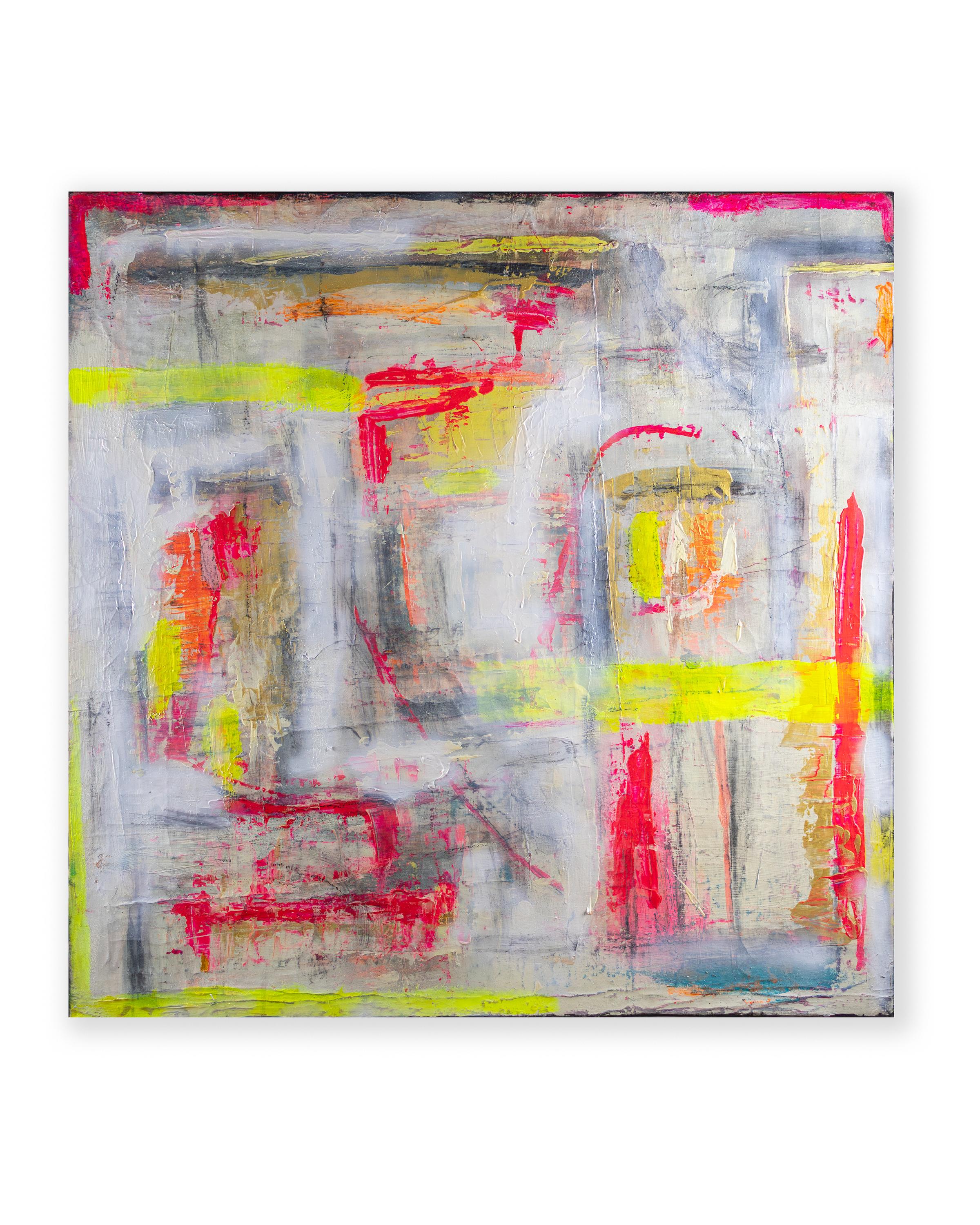 L’œuvre captive par un équilibre tendu entre des explosions de couleurs extatiques et des repeints apaisants. Des accents néon lumineux en rose, jaune et turquoise brillent comme des impulsions énergétiques à travers de généreuses couches de blanc et de gris clair. Un vernis final conserve cette intensité si parfaitement que l’œuvre semble en permanence « fraîche ».