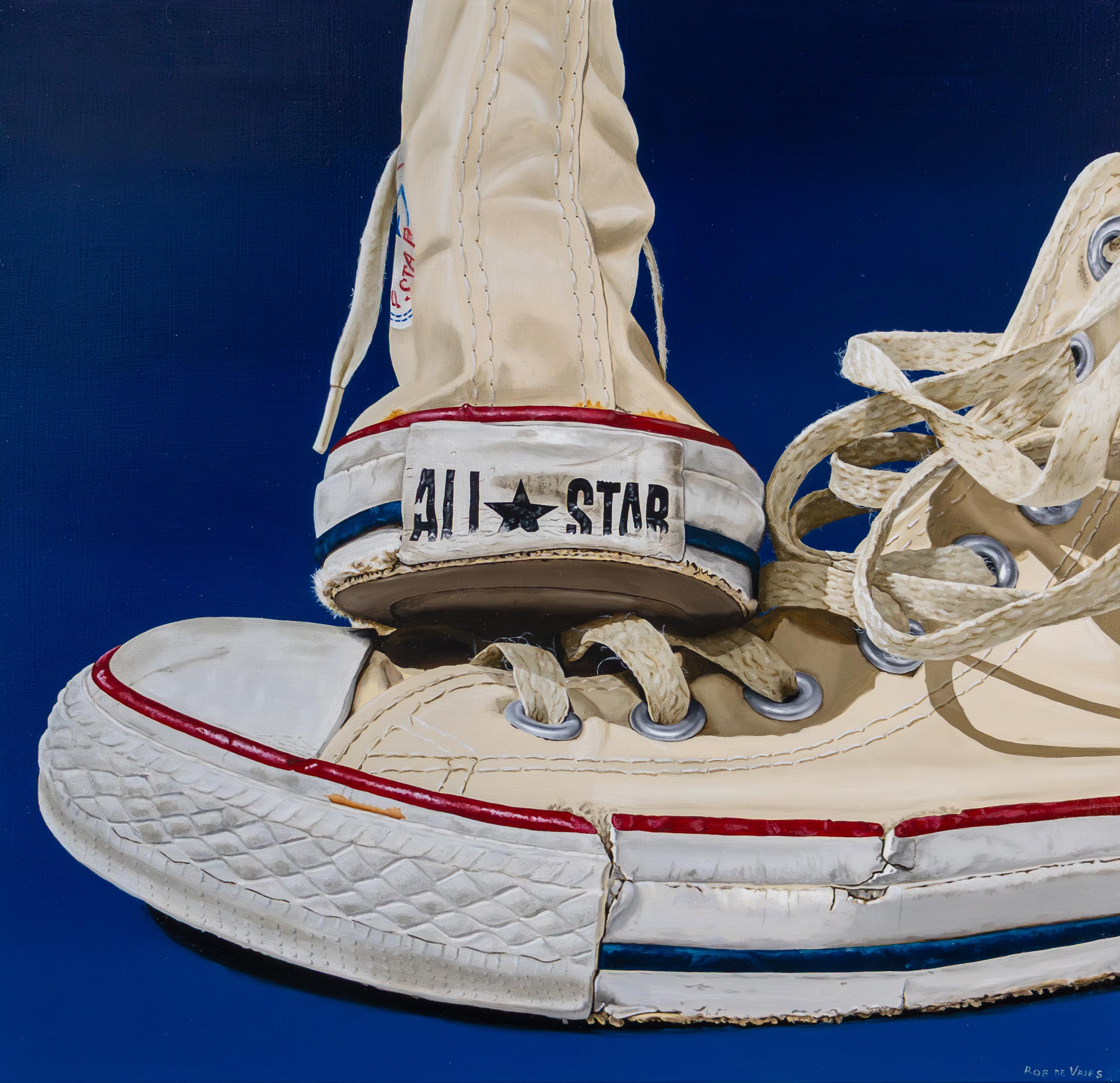 La représentation dans Worn out but still wearable se concentre avec maestria sur les détails haptiques d’une paire de baskets Converse usées. Dans le cadre de la série Memories of a happy childhood, de Vries reproduit les fissures du caoutchouc, les lacets effilochés et la texture délavée du tissu avec une telle précision que le titre devient immédiatement tangible. La composition, où une chaussure repose lourdement sur l’autre, crée une forte profondeur plastique sur le fond bleu profond. Chaque éraflure sur la pointe en caoutchouc devient le témoin d’aventures enfantines, soulignant le caractère de la série où les traces d’usure sont mises en scène comme de précieux vestiges d’une enfance heureuse.
