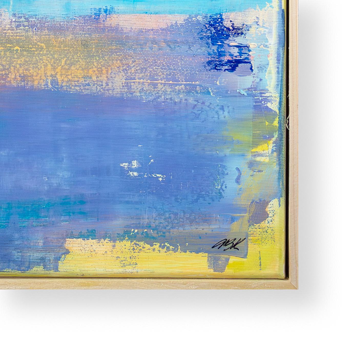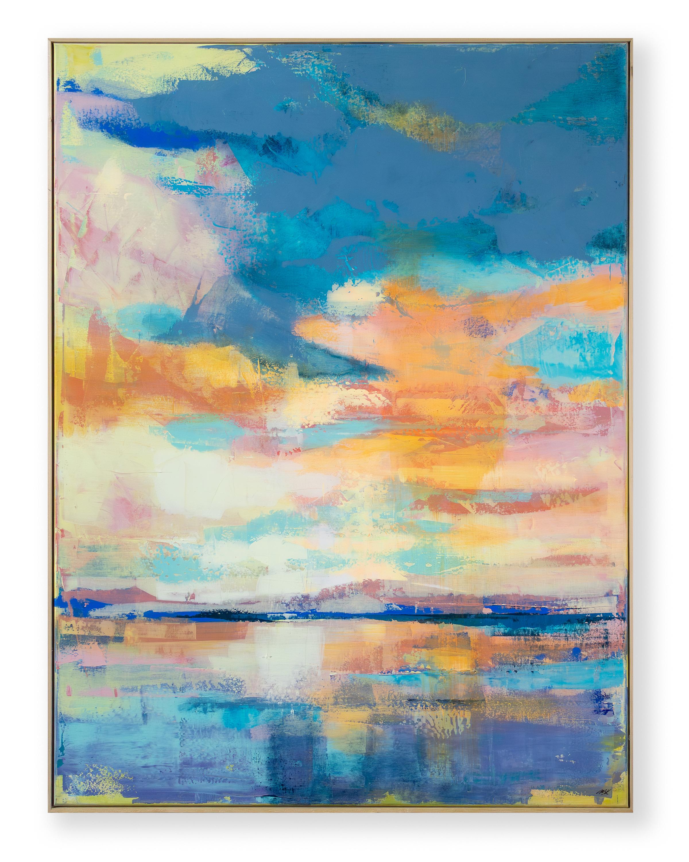 In Celestial Clarity vangt Ana Barbić Katičić de magie van een schilderachtige ochtend aan de kust, wanneer het eerste licht de nevel verdrijft en de wereld in stralend blauw dompelt. Het werk wordt gedomineerd door een heldere, maritieme frisheid die de kijker direct herinnert aan de weidsheid van de Adriatische Zee. Terwijl zachte geel- en rozetinten in het centrum de warmte van de zon suggereren, zorgt het krachtige azuurblauw in het bovenste gedeelte voor een oneindige diepte. Het is dat vluchtige moment van absolute rust, waarin de gloeiende hemel het water raakt en alles opgaat in een zachte weerspiegeling op het zeeoppervlak.