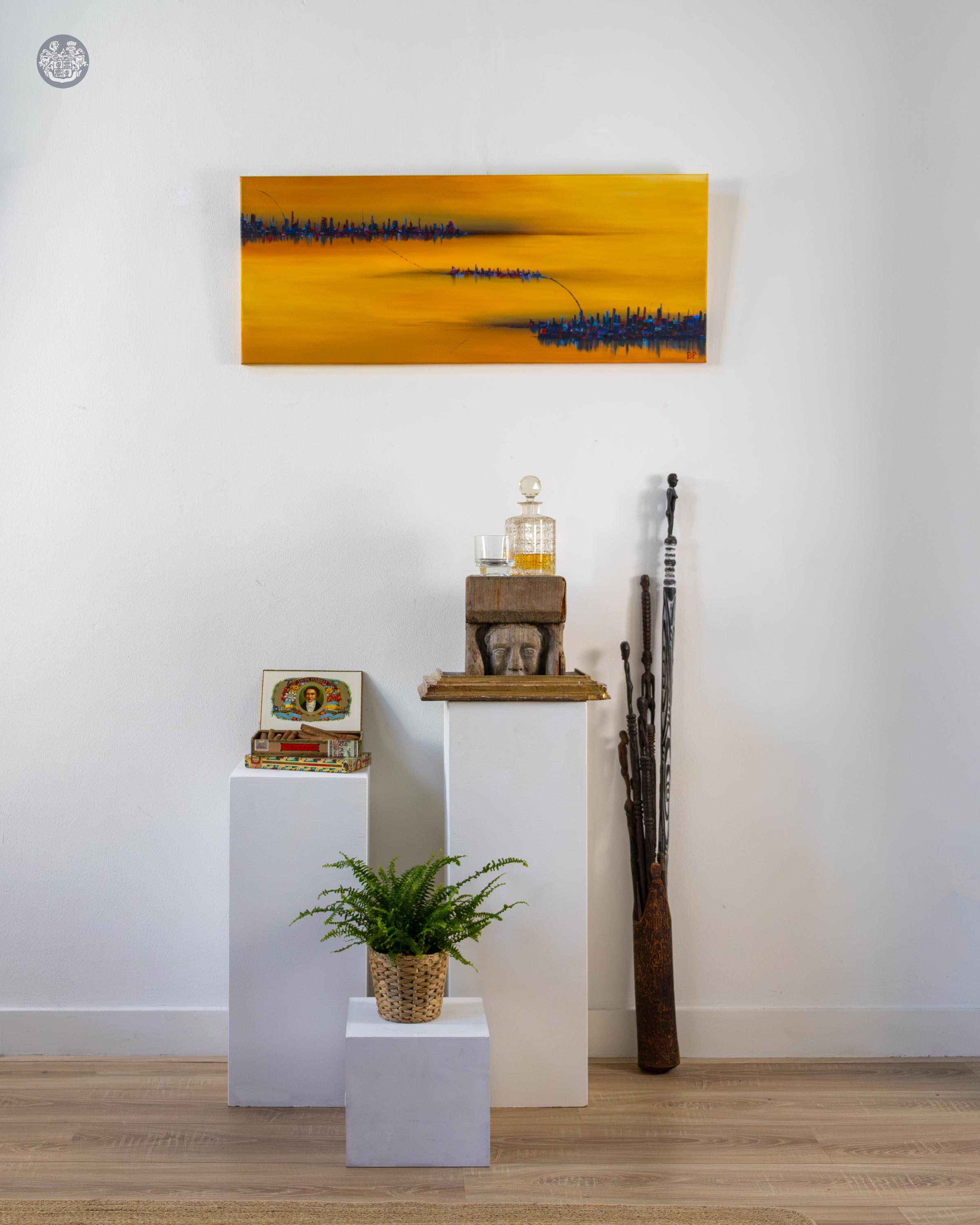 Het werk Dujen City II is een atmosferische interpretatie van stedelijke dynamiek en architectonische structuren. In deze compositie verwerkt Ben Put de indrukken van moderne metropolen, waarbij de grens tussen abstractie en figuratieve weergave bewust open blijft. De toeschouwer herkent de contouren van steden die weerspiegelen in een wateroppervlak, waardoor een spel van realiteit en reflectie ontstaat. De verticale lijnen van de gebouwen ontmoeten de horizontale rust van het water, wat het schilderij een bijzondere ruimtelijke diepte en een bijna droomachtige kwaliteit geeft.