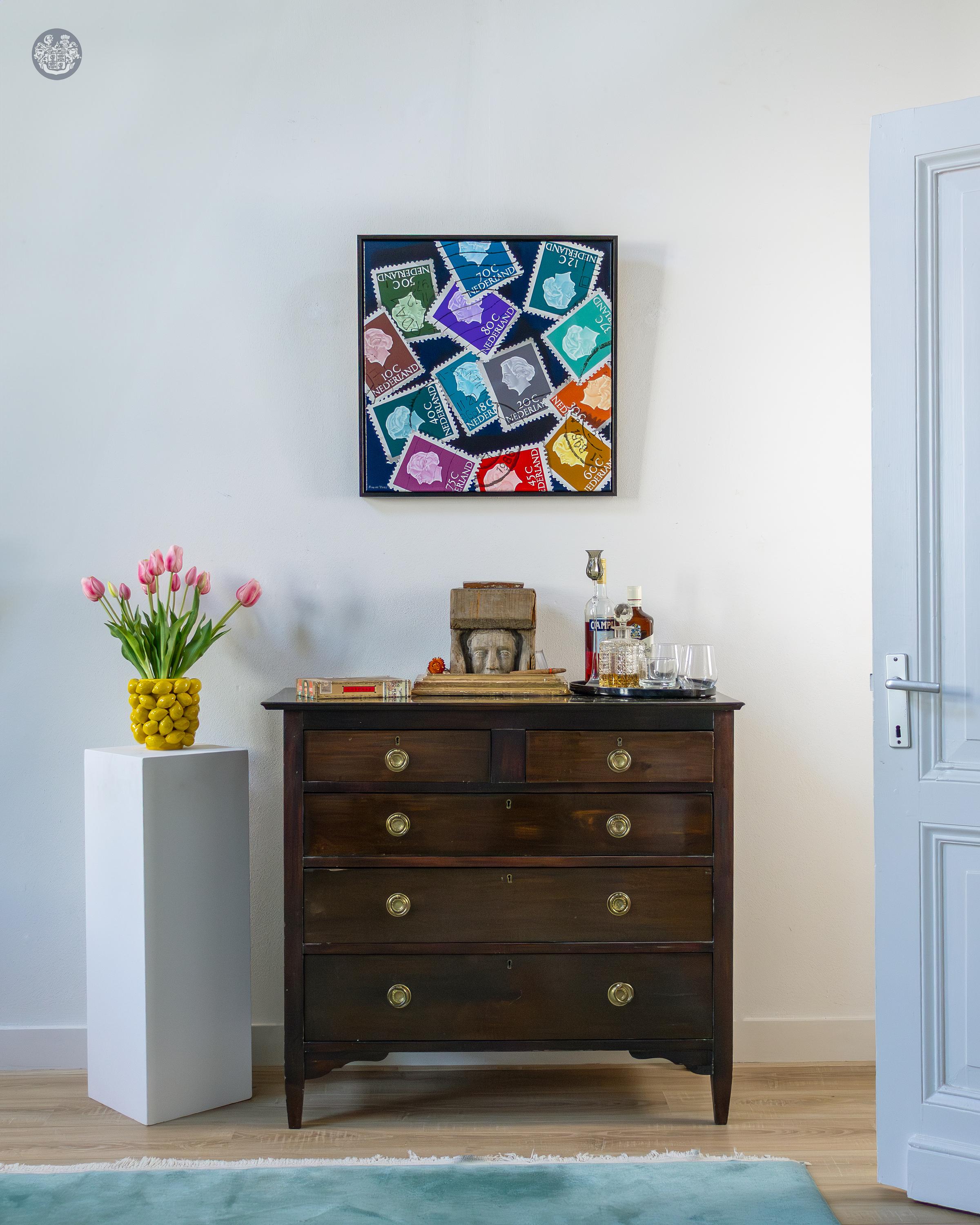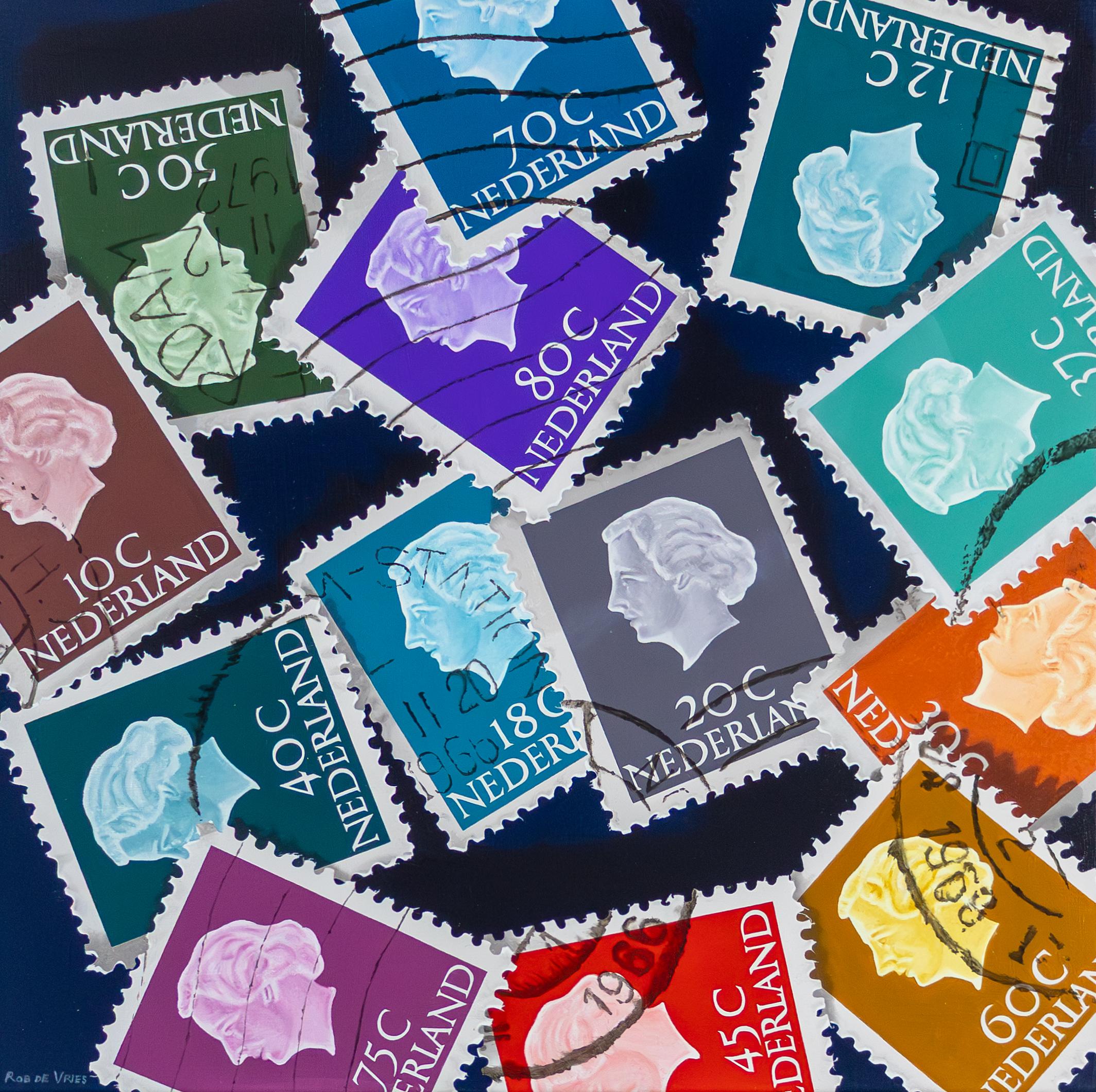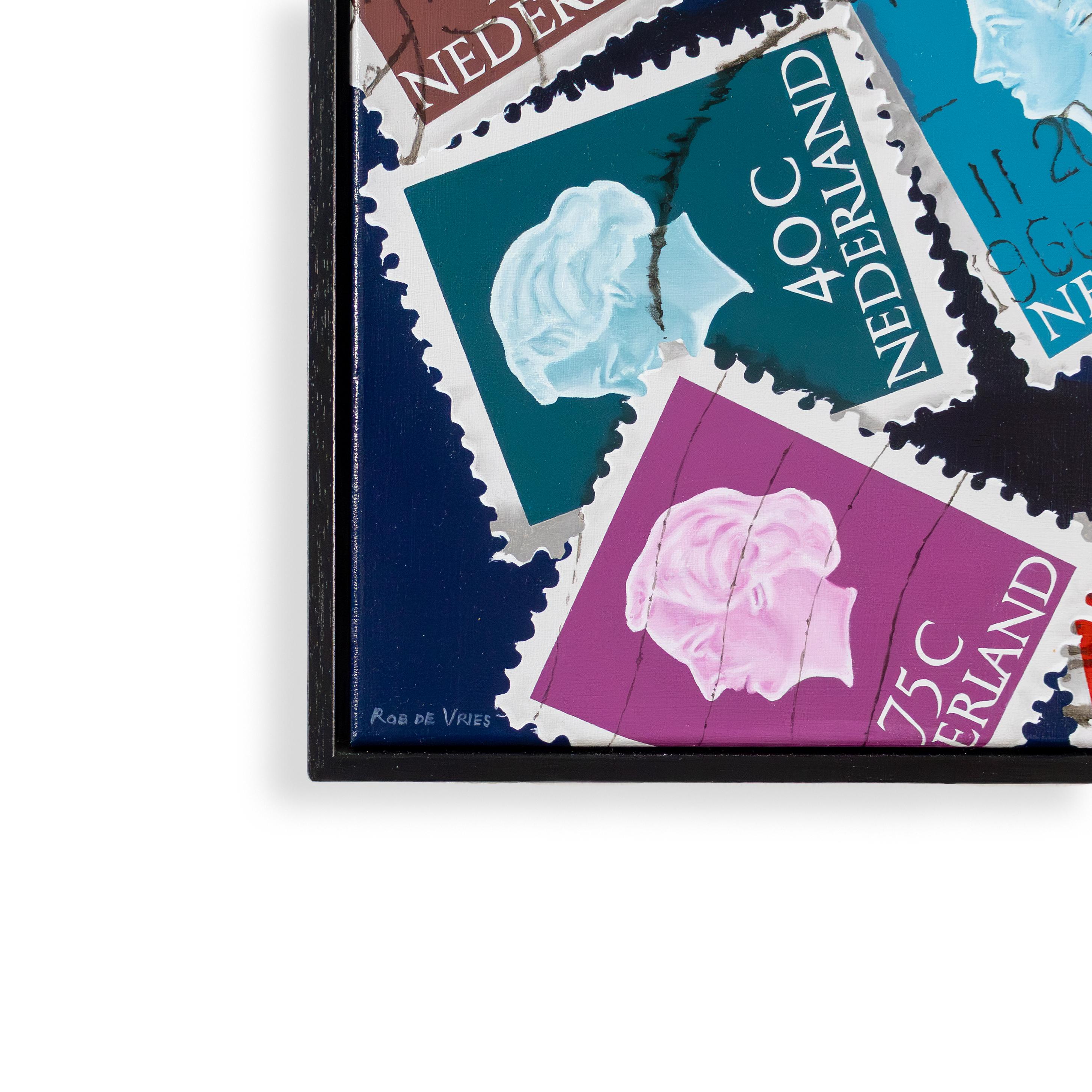 In de weergave van Hoeveel moet er op een brief? ontvouwt zich een fascinerende collage van historische Nederlandse postzegels. Als onderdeel van de serie Herinneringen aan een gelukkige jeugd worden de kleurrijke waardezegels geënsceneerd tegen een diepdonkere achtergrond, waardoor hun kleuren oplichten. De Vries vangt niet alleen de grafische kwaliteit van de zegels, maar ook de sporen van hun geschiedenis: de onregelmatige poststempels en de fijne slijtageplekken aan de randen. De compositie speelt handig met overlappingen en verschillende hoeken, waardoor een dynamische visuele puzzel ontstaat die de nostalgische waarde van het verzamelen viert als een kostbaar relikwie van een gelukkige jeugd.