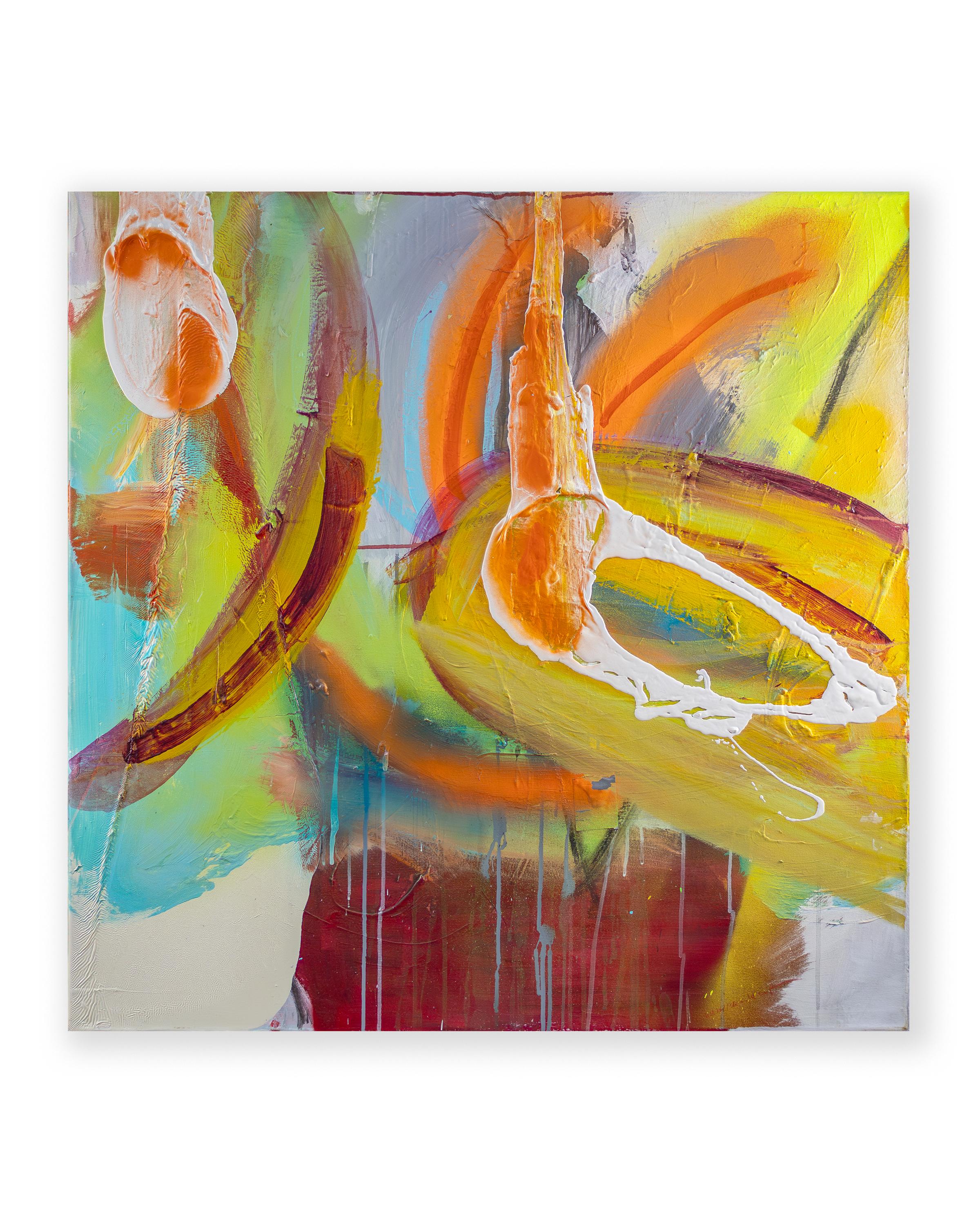De bewuste beslissing om grote delen van de lichte ondergrond open te laten, fungeert daarbij als een actief lichtelement en laat de kleuren als pure frequenties in de ruimte staan. Uiteindelijk wordt Spritz II zo een visuele partituur van het onvatbare. Omdat het beeld van alle kanten is geschilderd, is er geen “juiste” kant – het werk dwingt de toeschouwer om zelf in beweging te blijven en de balans tussen de wilde verfaanbreng en de ritmische ordening steeds weer opnieuw te ontdekken.