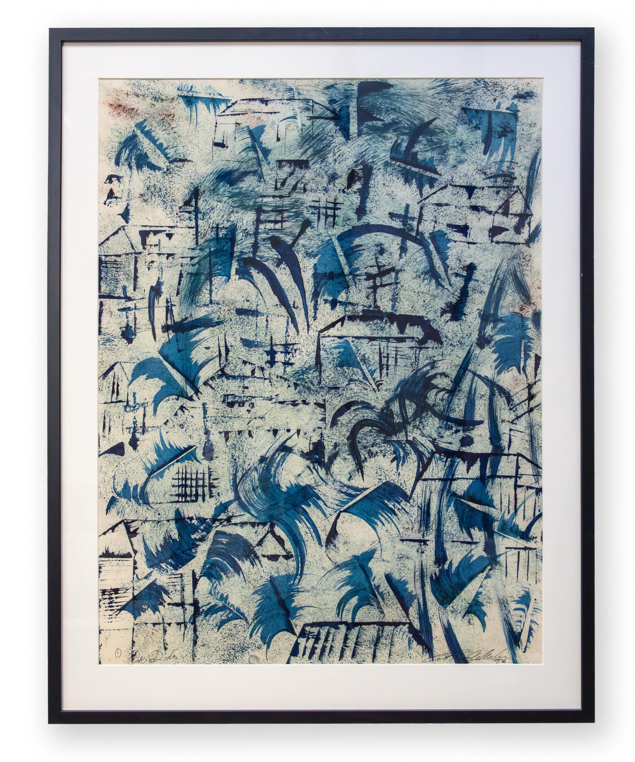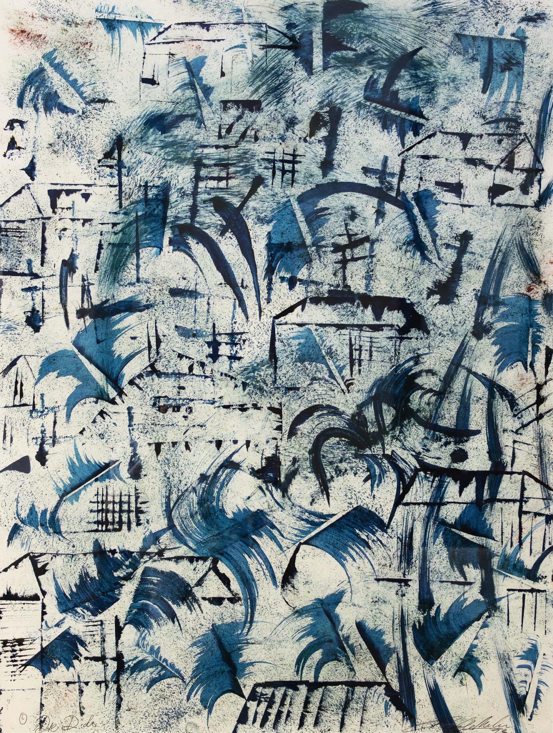 De compositie balanceert tussen structuur en ontbinding: huizen en golven lijken samen te vloeien, alsof de zee het dorp al heeft verzwolgen. De titel verwijst niet alleen naar het vogelperspectief, maar ook naar de symbolistische dimensie: als in een nachtmerrie wordt de scène van bovenaf zichtbaar – afstandelijk, maar vol existentiële dreiging. Het werk spreekt over angst, vergankelijkheid en verlies – blauw domineert als kleur van water, van verdrinking en ondergang.