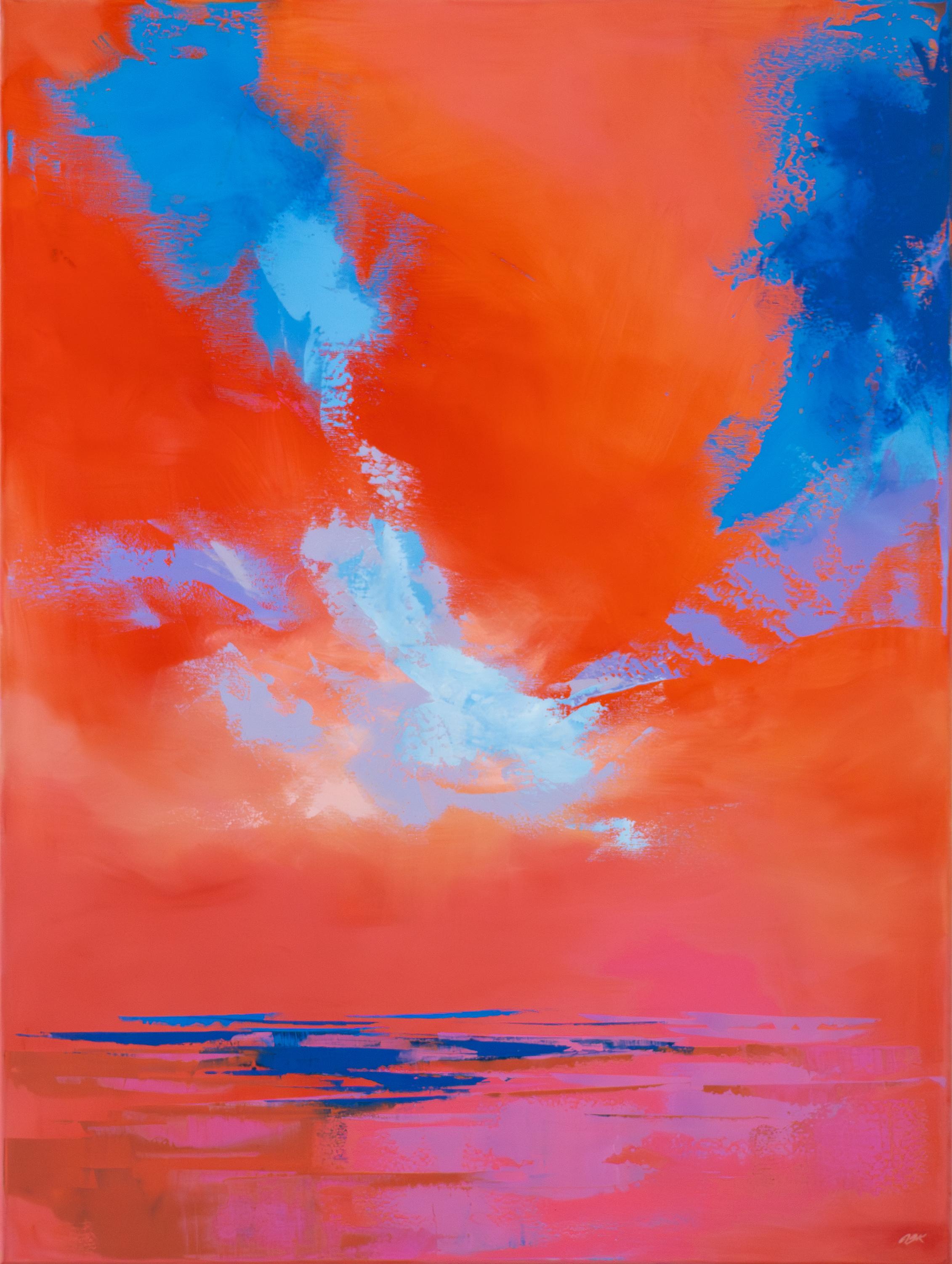 Technically masterful, the artist uses layering and the deliberate dragging of paint to create a palpable texture. The blue color formations appear partly sharp and defined, and partly softly merging into the surrounding orange, bringing to mind modern squeegee techniques (Rakeltechnik), though interpreted here in a softer and more atmospheric manner. The artist’s Croatian heritage and her familiarity with the intense colors and unique light of the Adriatic resonate in this dramatic juxtaposition of elemental forces. Beyond captures that specific moment known from holidays, standing on the shore as one’s gaze blurs into the distance – an image that immediately awakens a longing for the next summer by the sea.