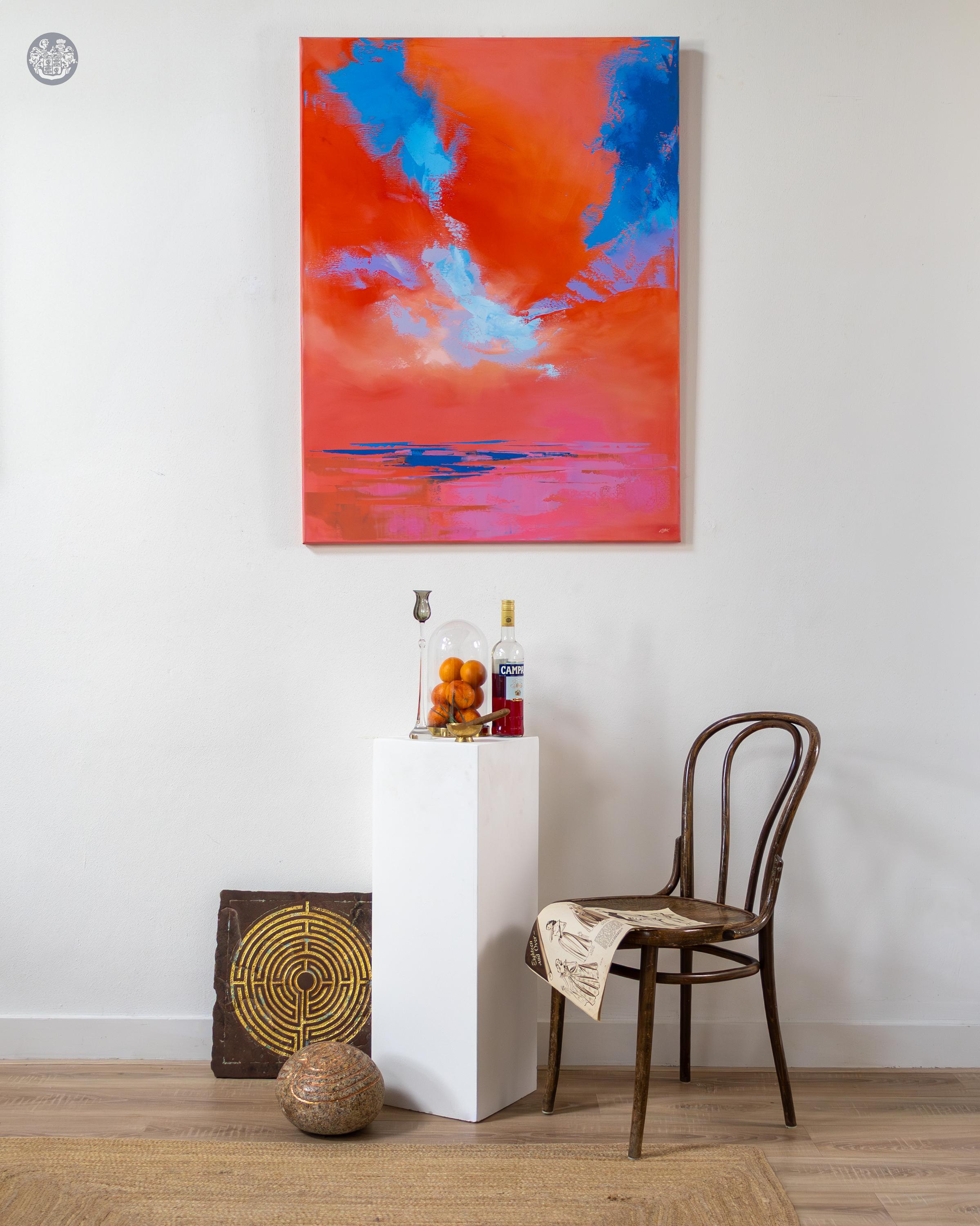In Beyond, Ana Barbić Katičić captures the overwhelming magic of a picturesque sunset, where the world appears to be set ablaze. The work is dominated by a pulsating red-orange that occupies nearly the entire canvas, creating an atmosphere of intense emotional warmth and infinite vastness. This all-consuming color is pure energy, immediately casting a spell over the viewer. At the very bottom edge of the painting, this flaming spectacle is grounded by a narrow, darker structure of deep blue tones. It is the moment where the sky touches the water and is reflected within it, giving the image its powerful sense of depth and the familiar tranquility of a coastal landscape.