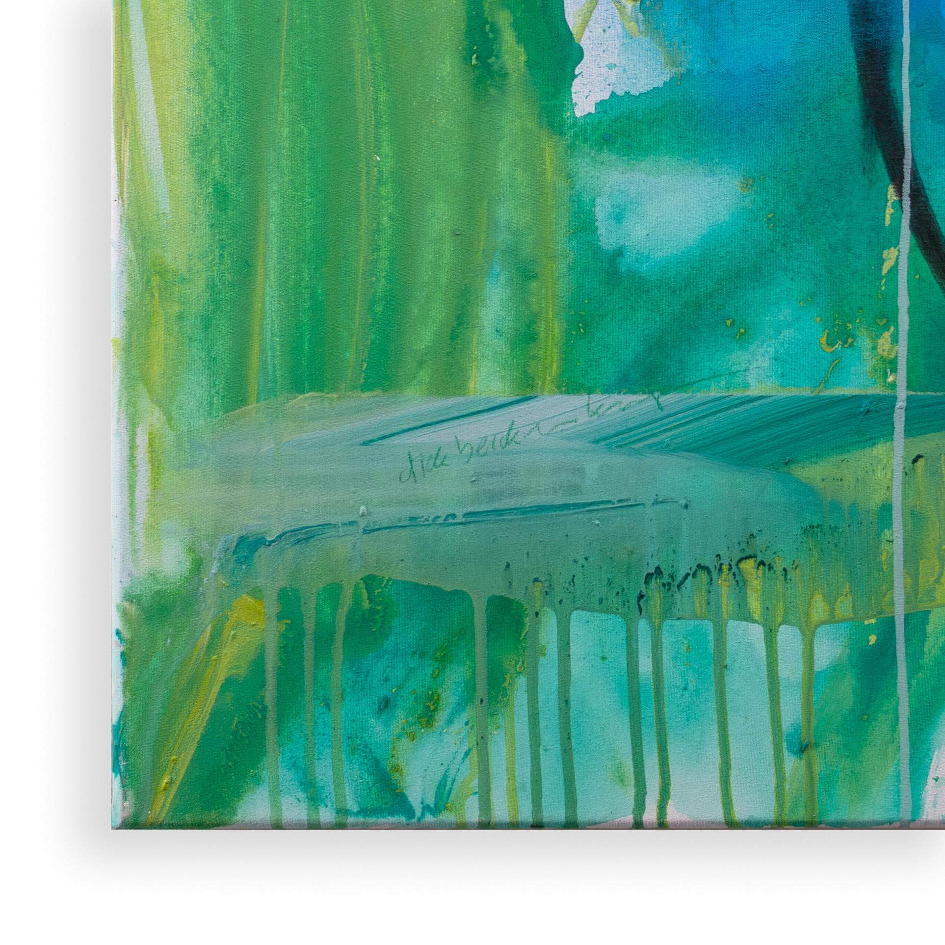 The composition is dominated by a vibrant palette of luminous green, lemon yellow, and turquoise accents that permeate the pictorial space like visual frequencies. These different colors can be interpreted as representations of various audio sounds: while the gentle green and yellow tones create a harmonious basic mood, the bold, almost pulsating orange and blue fields set rhythmic counterpoints. In this paradox, Berckenkamp combines the silence of the canvas with the invisible dynamics of sound waves, making the inaudible experienceable through color and form.