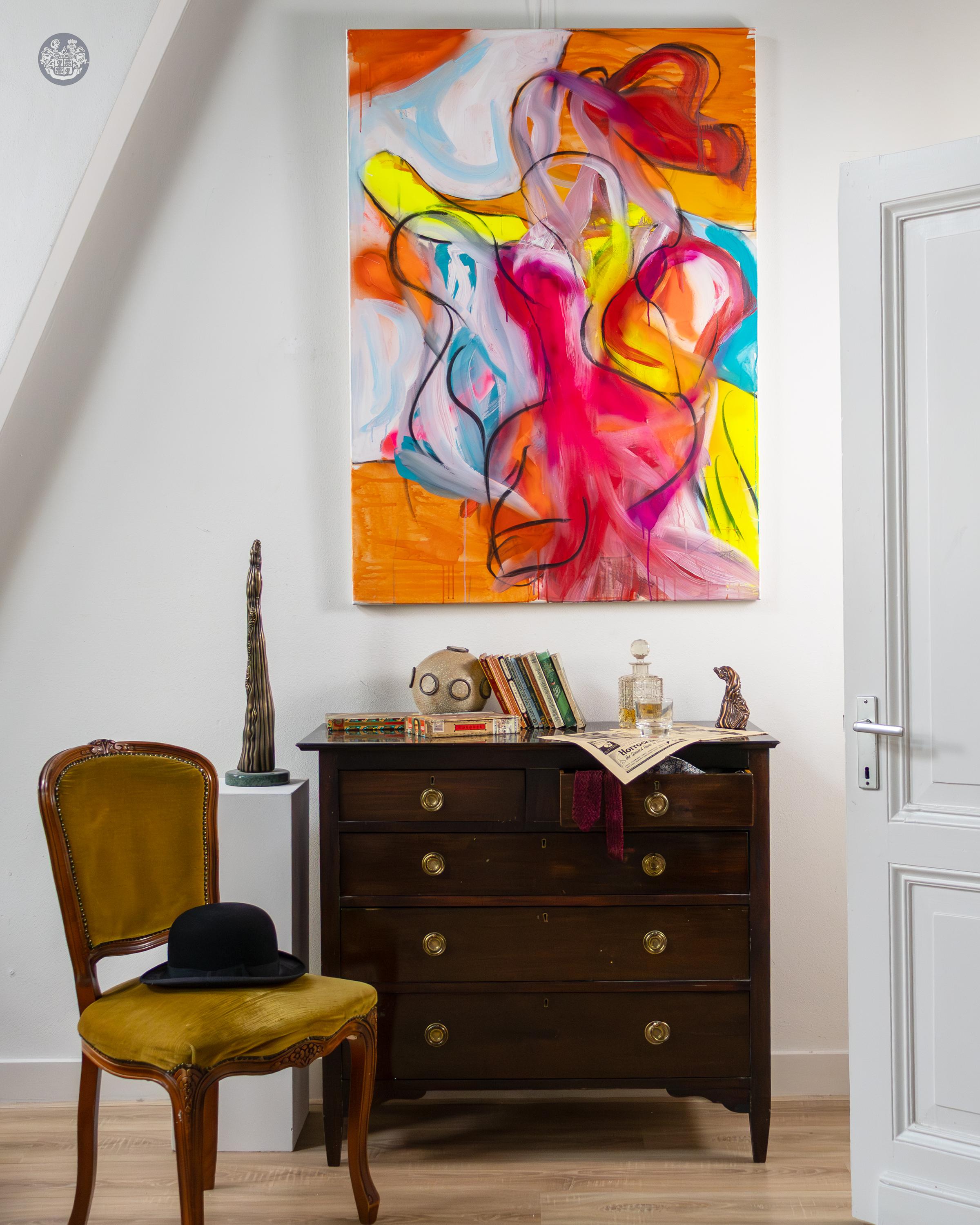 Despite the color density, the work maintains its clarity through cleverly placed white and turquoise accents. These points of light function as a necessary contrast to the heat of the central composition and give the figures room to breathe. Composition III (Heroes) is thus far more than a heroic depiction; it is the visual manifestation of an individual energy that transitions into a collective goosebump moment—a vibration that goes directly under the skin beyond the visible world.