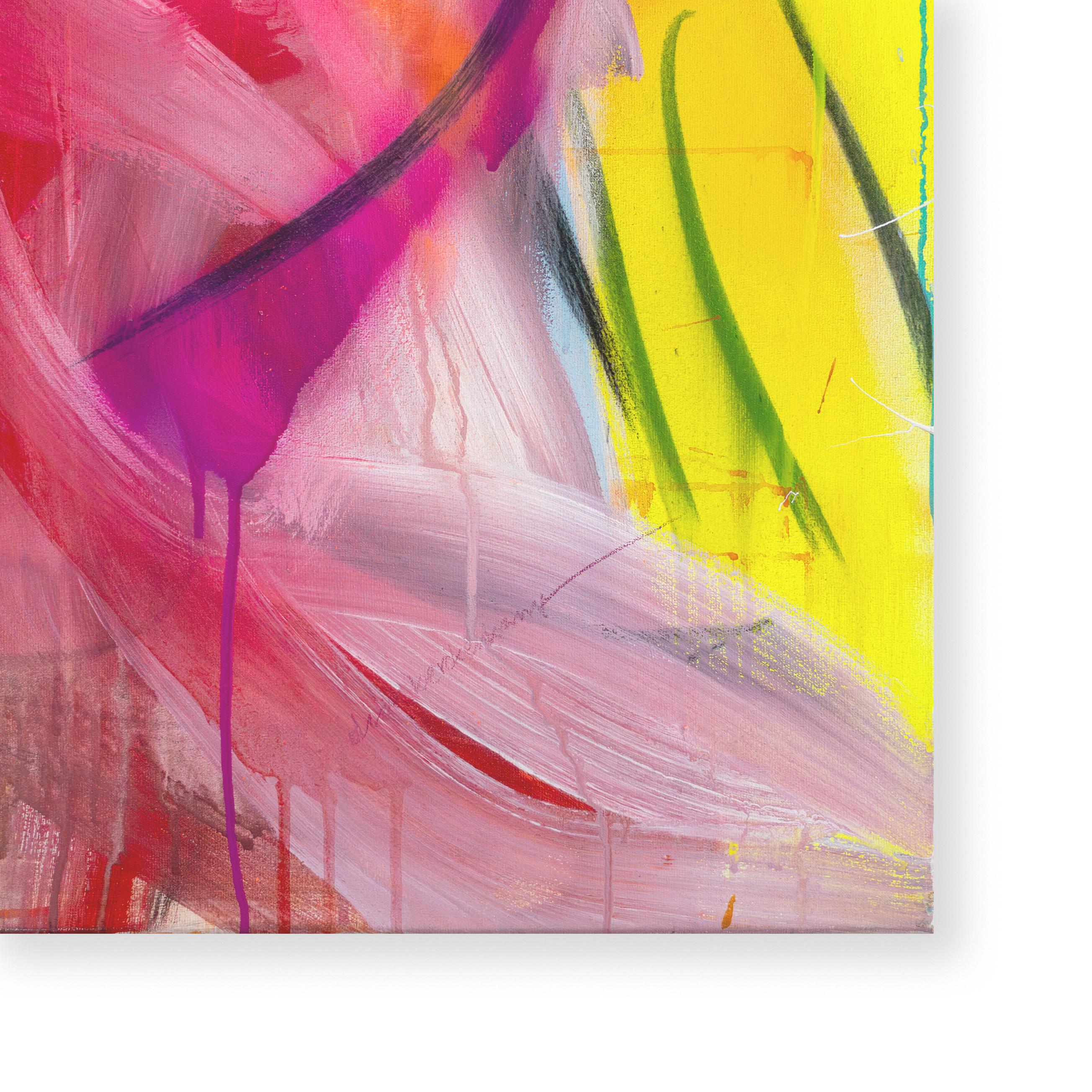 A rising dynamic manifests at the center of the image. The black contour lines, which appear particularly bold and confidently set in this work, suggest several figures. These “heroes” are not naturalistically tangible bodies, but energetic apparitions rising from the colorful chaos. The vibrant pink and red tones at the center form an emotional heart, radiating energy, power, and passion.
