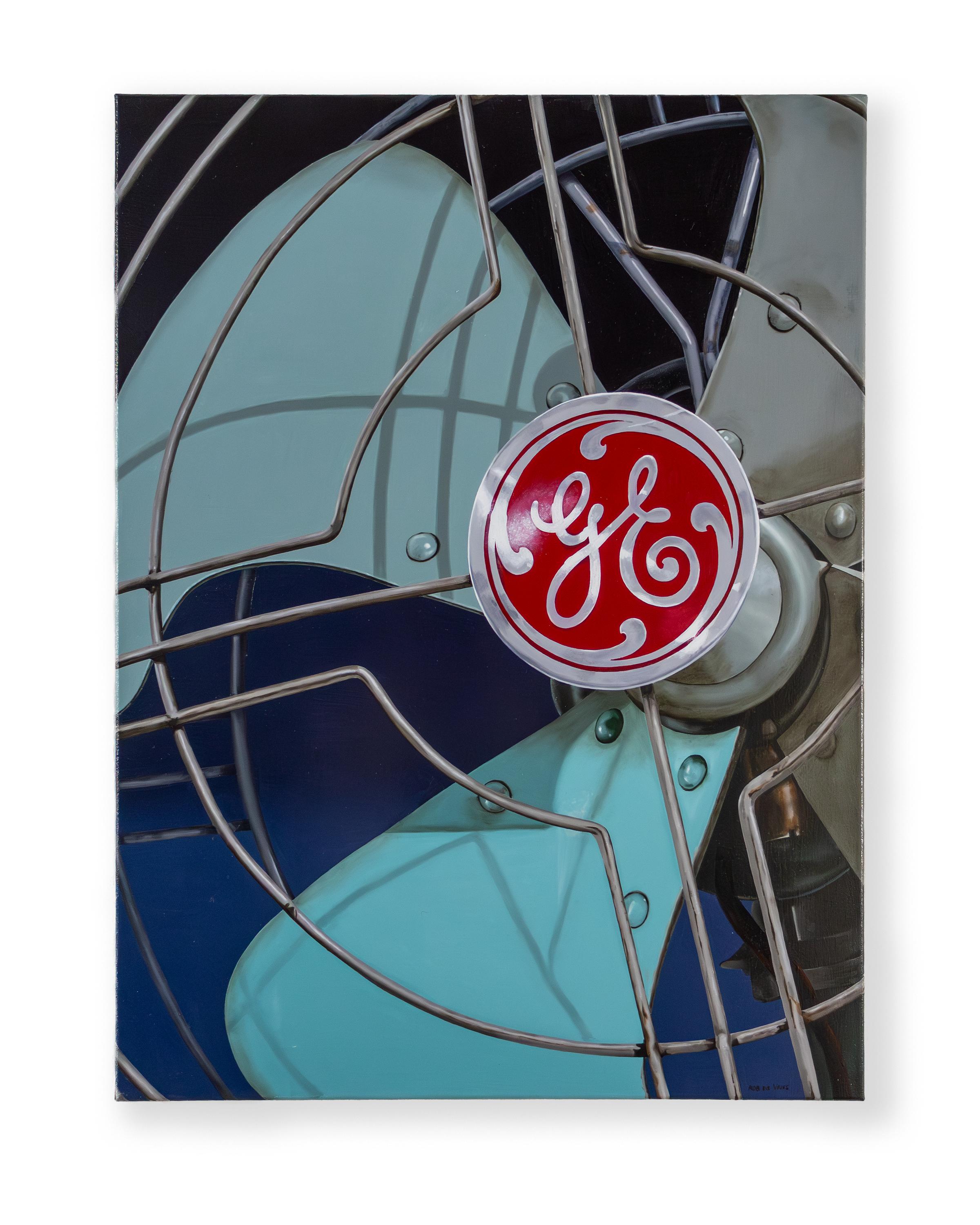 The work GE fan by Rob de Vries fits seamlessly into his series Vintage stuff and demonstrates a modern continuation of Photorealism. With impressive technical precision, De Vries captures the various textures of the retro fan – from the matte, lacquered blades in different shades of blue to the shiny metal grill. In his series Vintage stuff, De Vries focuses on everyday objects through an extreme macro perspective, giving them a monumental presence. The virtuoso lighting on the central GE plaque makes it appear almost three-dimensional, transforming industrial design into a meditative, artisanal art form.