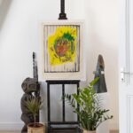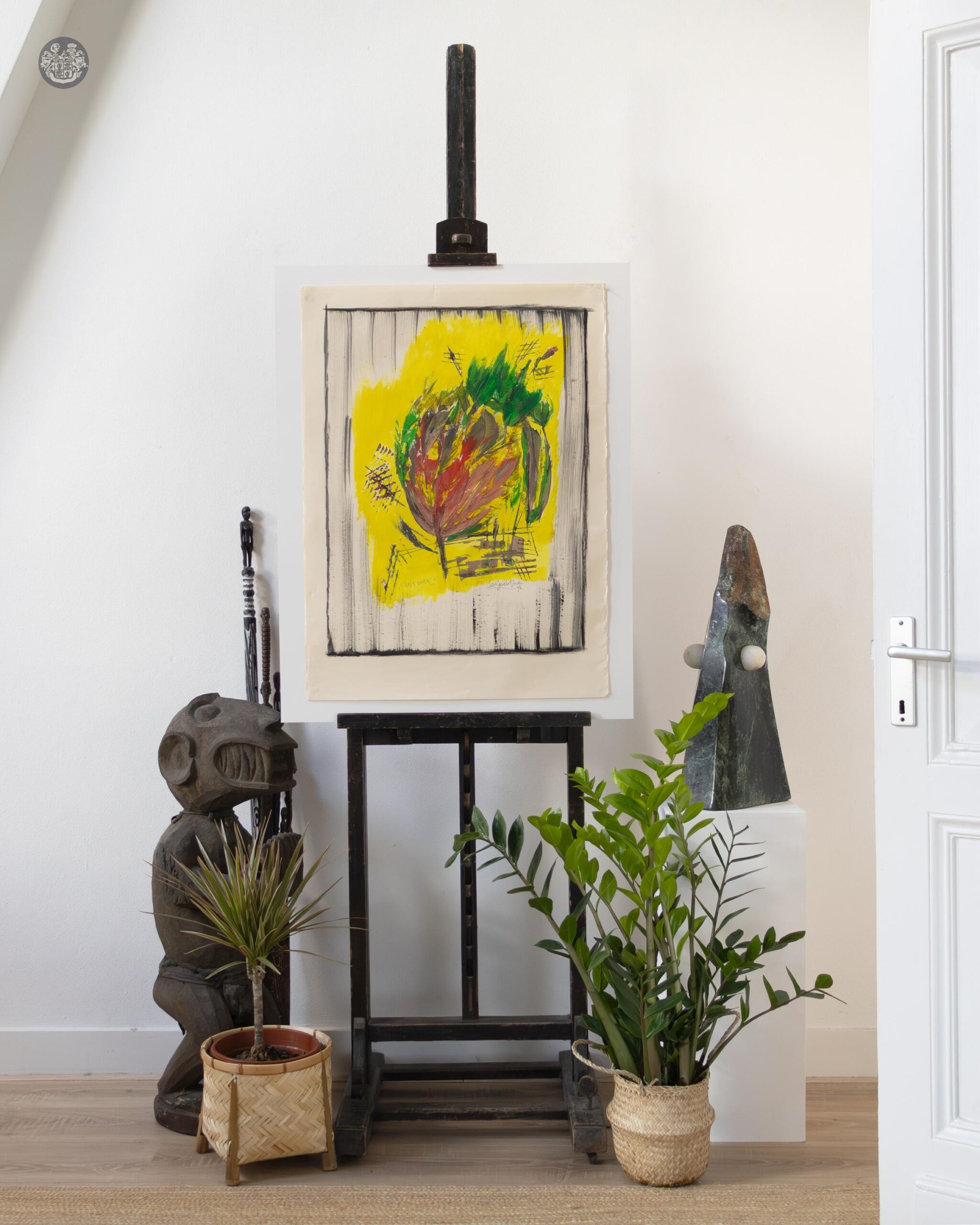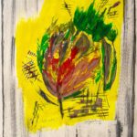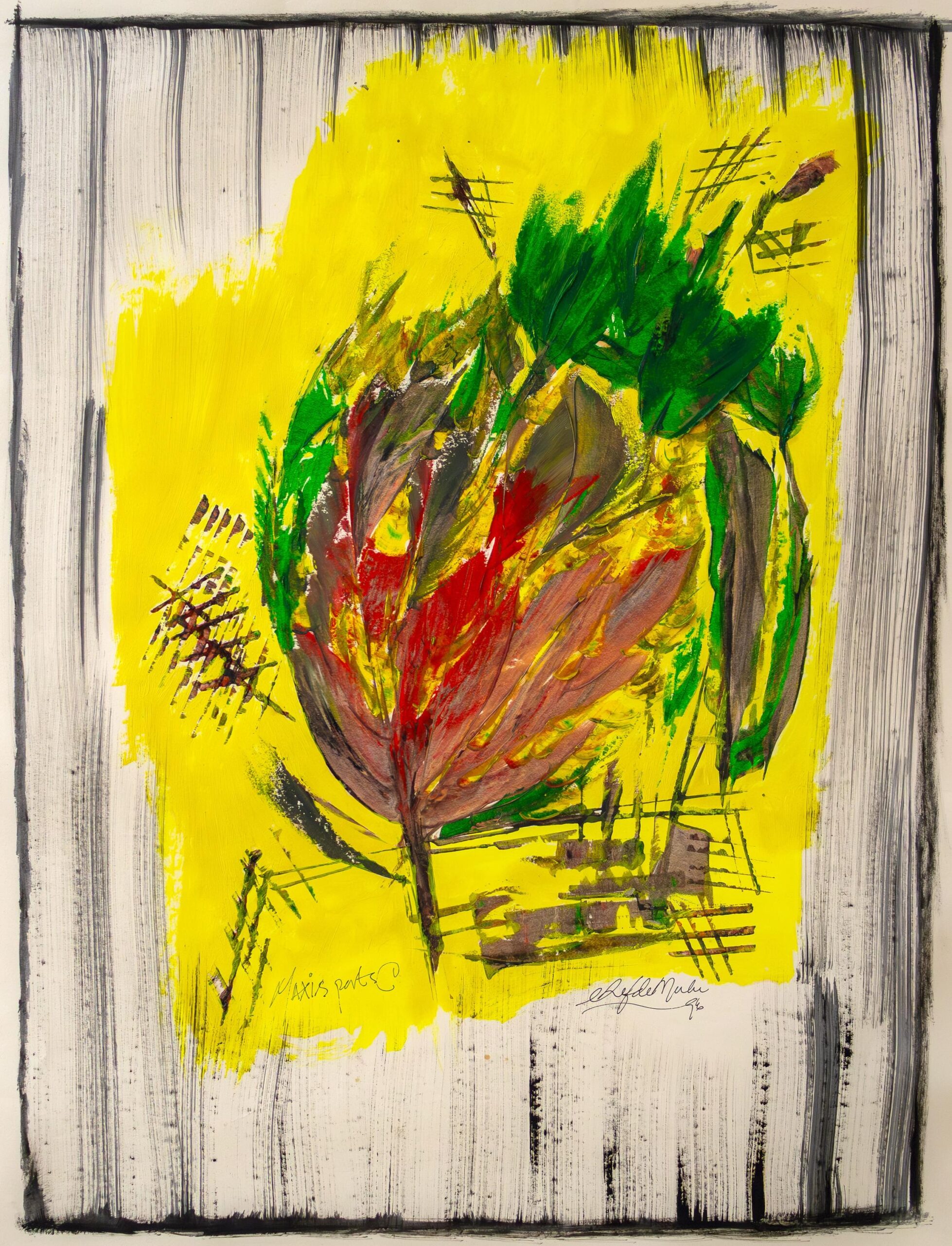 In Maxis II a powerfully placed tree emerges at the center, its form unfolding rhythmically in reds, greens, and browns. The luminous yellow surrounding it suggests the time of day and enhances the atmosphere of the scene.