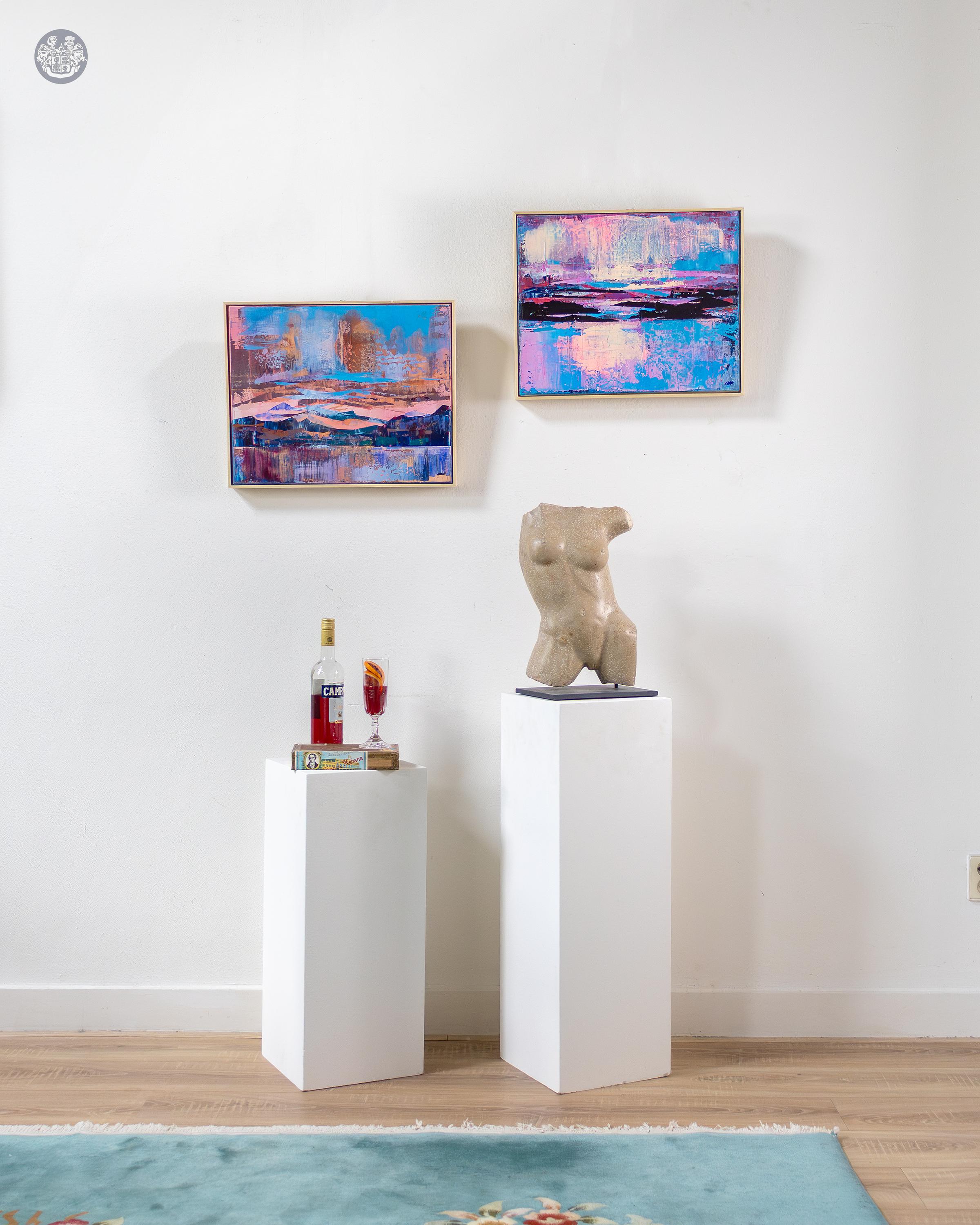 In Silent Radiance, Ana Barbić Katičić captures the magic of a picturesque evening, shortly after the sun has disappeared behind the coast. The work radiates a deep, majestic tranquility, while the remaining light tints the sky in a soft rosé and vibrant turquoise. The composition is dominated by the massive silhouettes of a mountain range or a prominent cliff coastline, standing out darkly against the twilight horizon. It is that fleeting moment of absolute silence in which the colors glow most intensely before night falls.