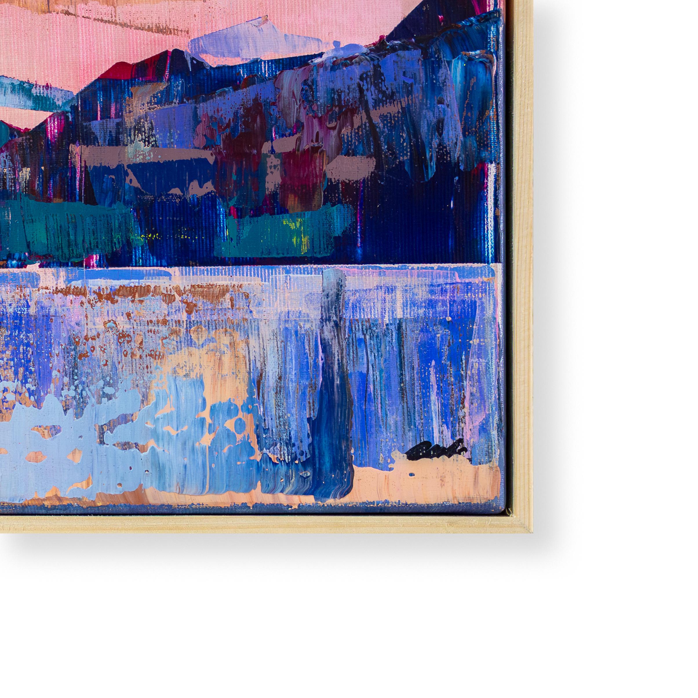 Technically masterful, the artist uses the squeegee technique to depict the rugged structures of the elevations. With powerful, horizontal movements, the paint was dragged across the canvas, creating the typical broken edges that recall rocky ridges or the texture of stone. This haptic layering in the middle section of the image forms a strong contrast to the softer color gradients of the reflection in the foreground. Silent Radiance acts like a window into untouched nature, opening the space and immediately awakening a longing for the clarity and peace found by the water.