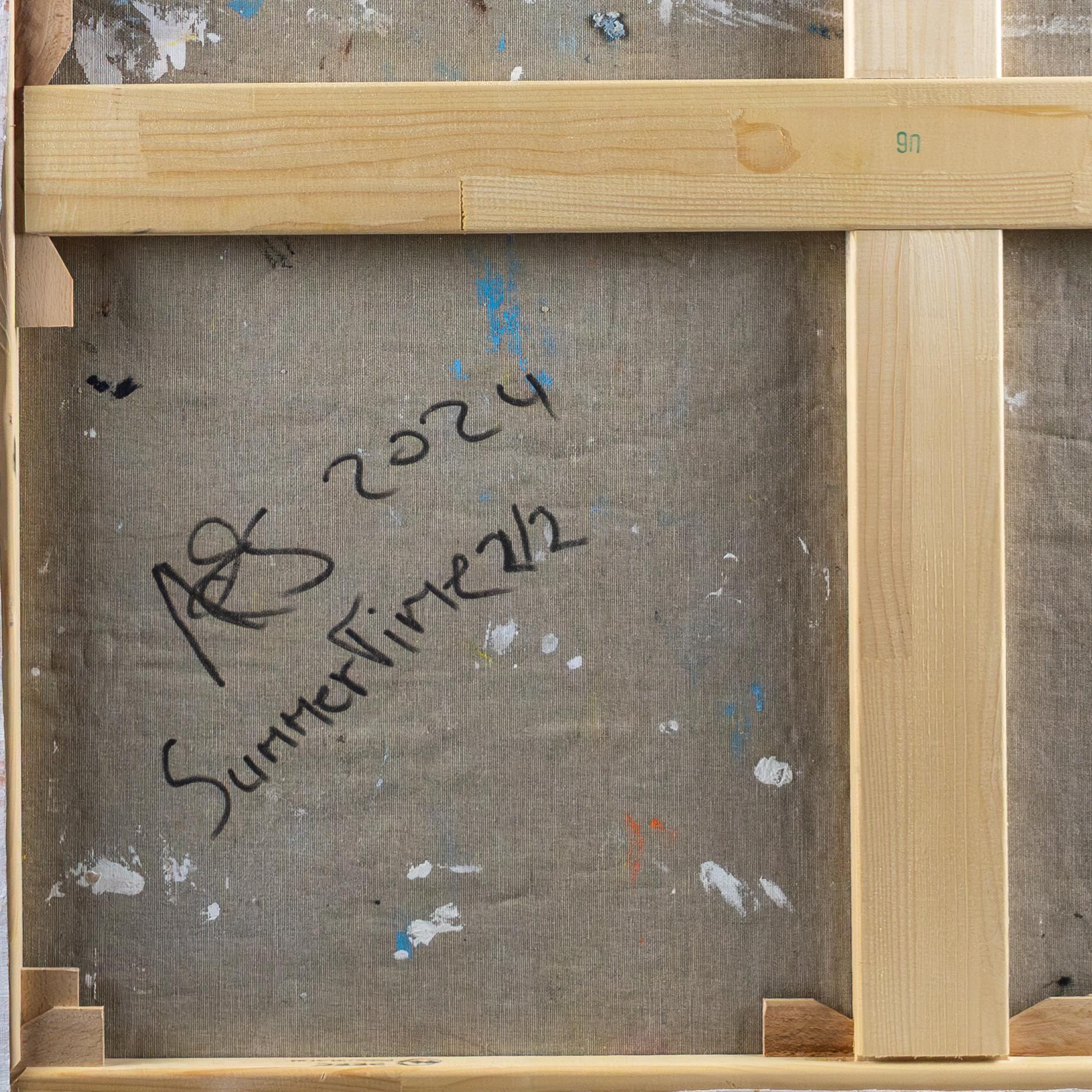 The title Summertime reveals itself in a radical play with perception: neon pink and lemon yellow function as chromatic shockwaves representing the aggressive vitality and oppressive heat of summer. These impulses are “masked” by white overpaintings, creating the effect of a blinding overexposure. It is the visualization of that moment in midsummer when the light becomes so bright that reality begins to shimmer and solid forms dissolve into pure vibration.