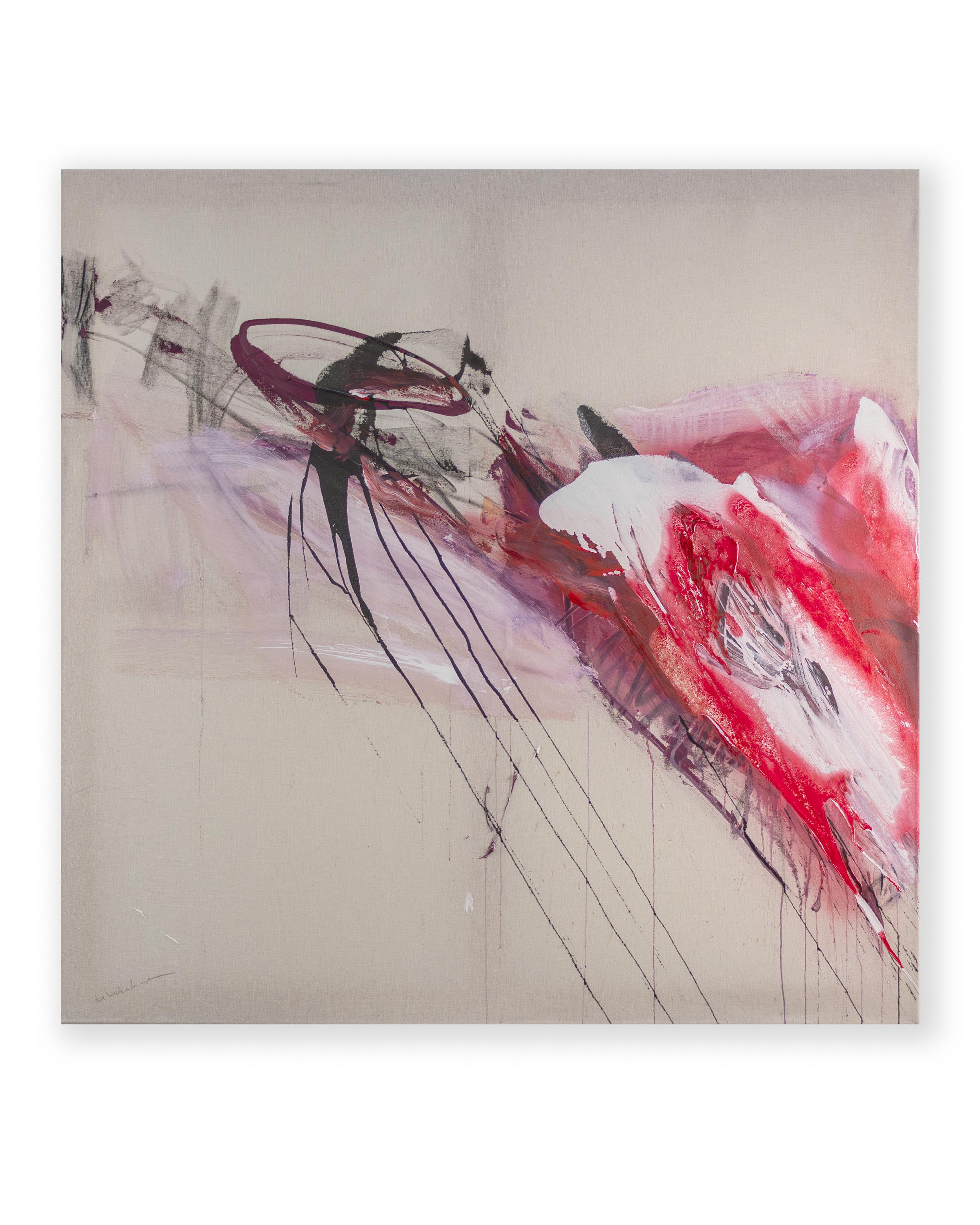 Although the composition on the canvas remains static, it unfolds a powerful suggestion of dynamics: the eye is guided across a dense core of fleshy red and pink tones, while sharp black lines intensify the impression of sudden movement. In this paradoxical effect, Berckenkamp connects to the tradition of “captured time,” in which the energy of a single blink of an eye is made permanent.